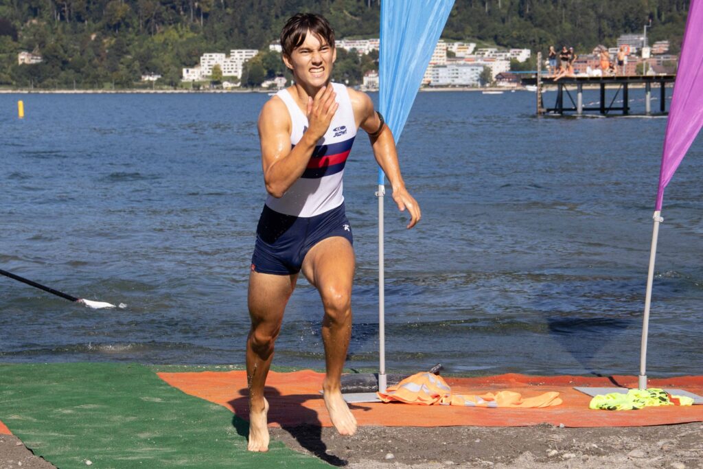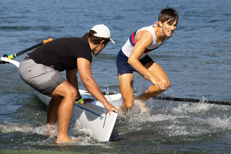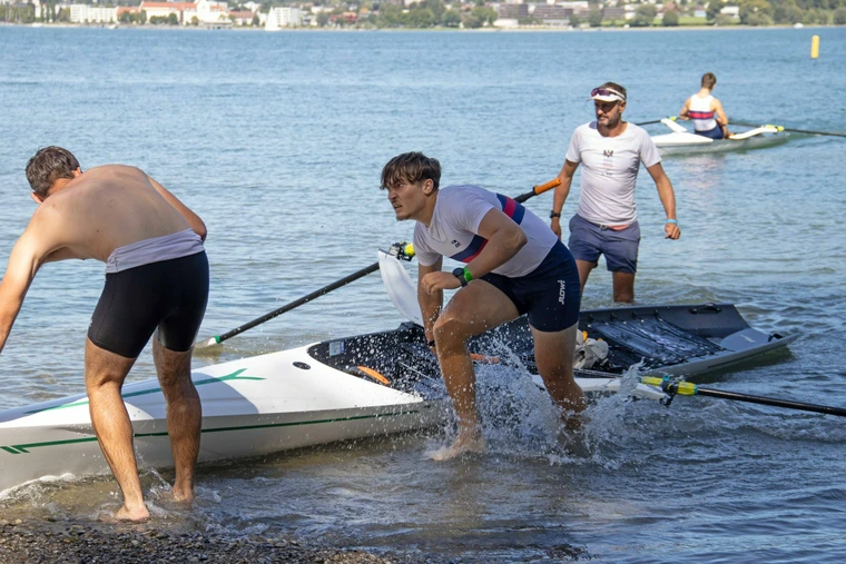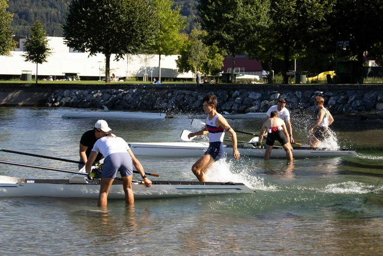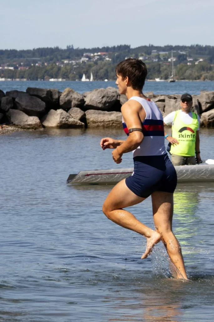 Neben den Athlet:innen waren auch die Trainer Umbi und Luggi voll im Einsatz: Als sogenannte Boat Handler sorgten sie für einen schnellen „Einsprung“ ins Boot sowie die richtige Anlandung und fungierte als „Hampelmänner“, um uns die richtige Navigation um die Bojen zu erleichtern.