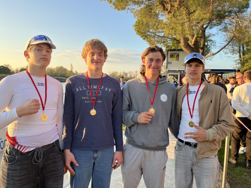 Zum Abschluss des Tages gingen unsere Jungs Hasan, James, Felix und Konsti im JMB4- aufs Wasser. Die vier sind ja durch ihre Teilnahme bei der Olympic Hopes Regatta und dem Coupe de la Jeunesse schon international erprobt und konnten ihre Stärke wieder mal beweisen. Von Anfang am ruderten sie stark weg und ließen den Gegnern nie eine Chance! Sieg für Wien!